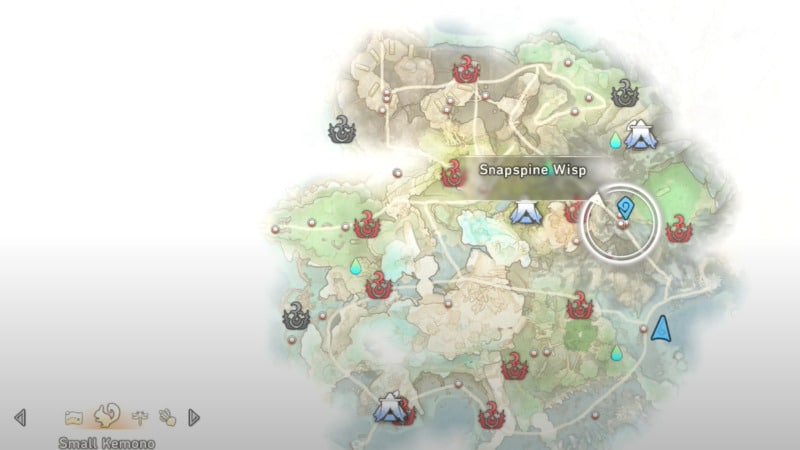 If you can’t find this Small Kemono, go to the map menu and set it to look for Small Kemono. To do this, you only need to click on the arrow in the lower left corner and switch to the mode with the image of a small squirrel. Then move your cursor over each gray dot and find the exact location of the Snapspine Wisps. Head over there and be prepared for a fight. You can defeat up to 6 Snapspine Wisps in one place and get several Snapspine Cotton at once.