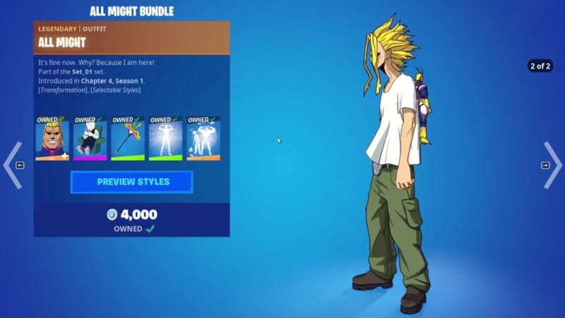 Of course, you don’t have to have all the extra fuss that comes with All Might. So, if you just want the All Might skin in Fortnite, you can simply pay 2000 V-Bucks since he’s also sold by himself.