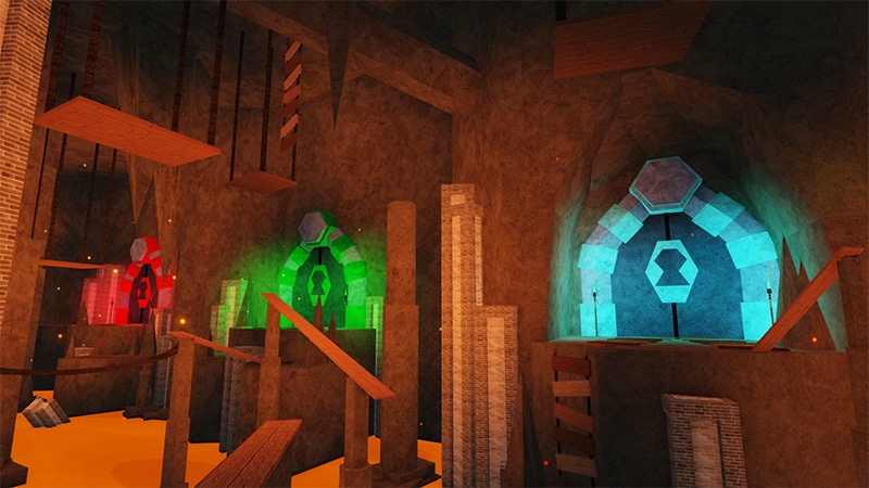 Inside, you will find a lot of lava and several doors of different colors. Behind each of them, you will find an obstacle course through which you will need to pass to get a sword of a certain color. And these swords are the keys to the doors. But even though the challenges in the cave are not very difficult, you will still often fall into the lava and start from the checkpoint. Therefore, you will spend a lot to open the final yellow door and reach the Excalibur Marker. But it is worth noting that after this, you will need to go through another obstacle course behind the white door to pick up the Excalibur sword and finally collect the Excalibur Marker.