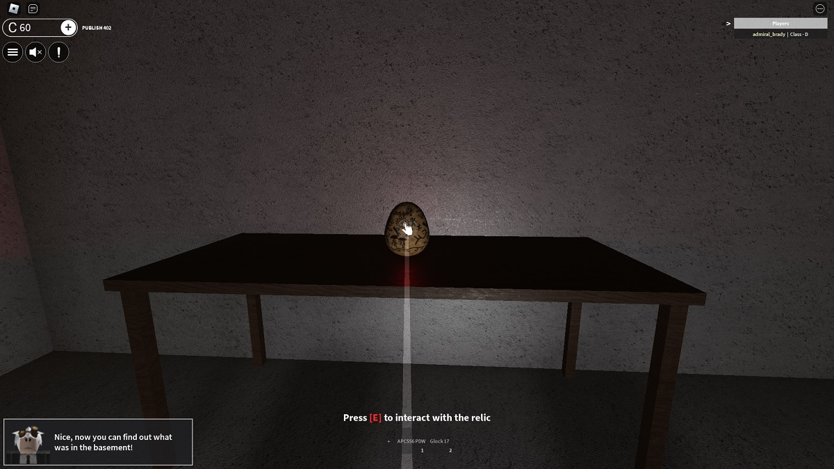 As soon as you pick up the Relic, you have to run all the way back to the bunker you came out of, avoiding faceless entities along the way. On the bright side, when you’ve returned the Relic in SCP: Roleplay, you’ll earn The Hunt: First Edition badge.