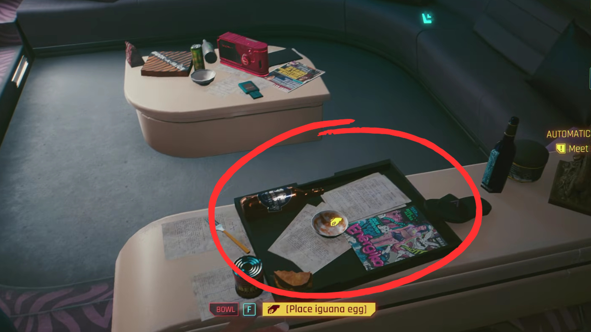 You have to complete “Playing for Time” before you can hatch the iguana egg inย Cyberpunk 2077. Once the mission is over, head back to V’s Apartment. Check near the center of the apartment around the couch to see a bowl. It’s here that you can interact and place the egg inside the bowl. You must wait 90-100 or so in-game days for the egg to hatch. Once it does, you can finally pet your new iguana friend. It can even interact sometimes with Nibbles if you’ve acquired the cat, too.
