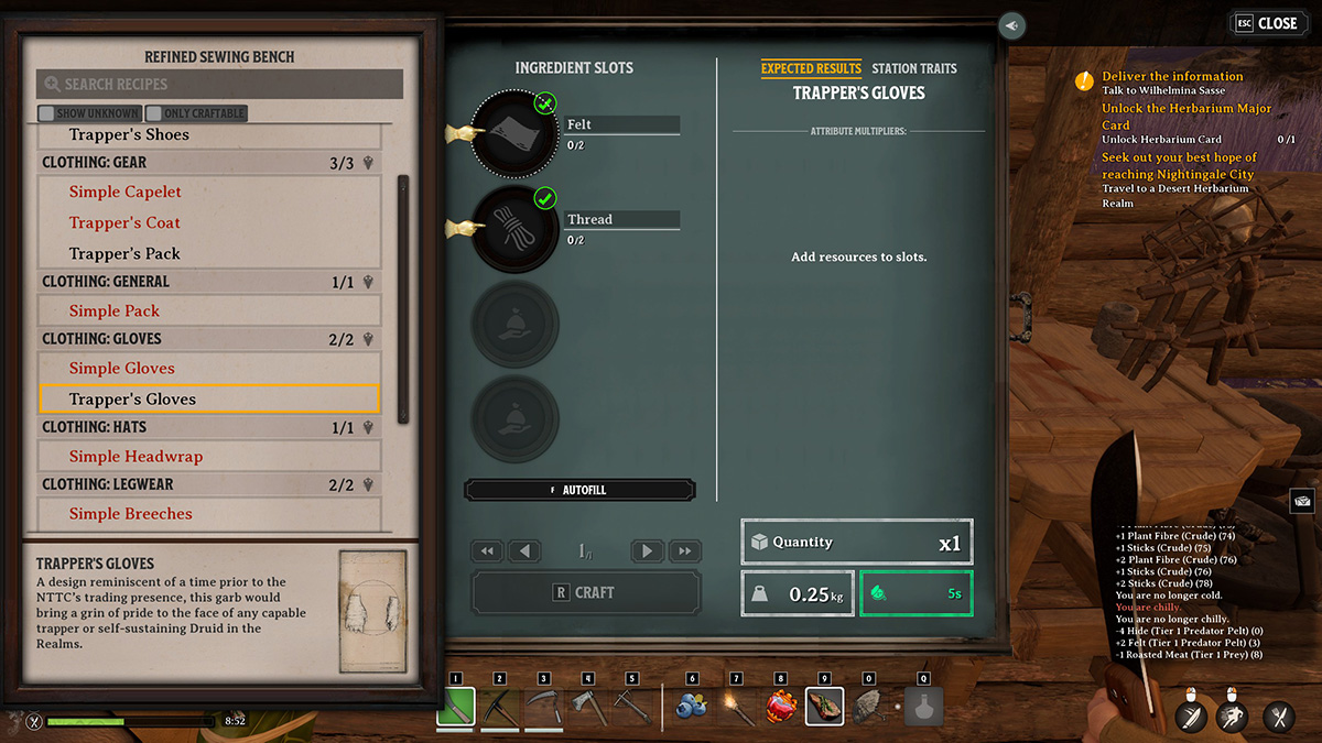 Before you can unlock or craft the Trapper’s Outfit, you must first make it to a Provisioner Realm. After that, you must craft the Refined Sewing Bench and have a whole bunch of Hide on hand to craft a ton of Felt.