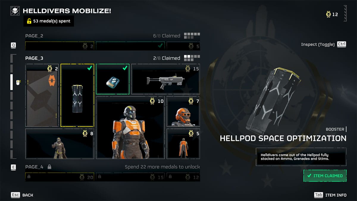- Hellpod Space Optimization: Helldivers come out of the Hellpod fully stocked on Ammo, Grenades, and Stims. (Page 3, 10 Medals).