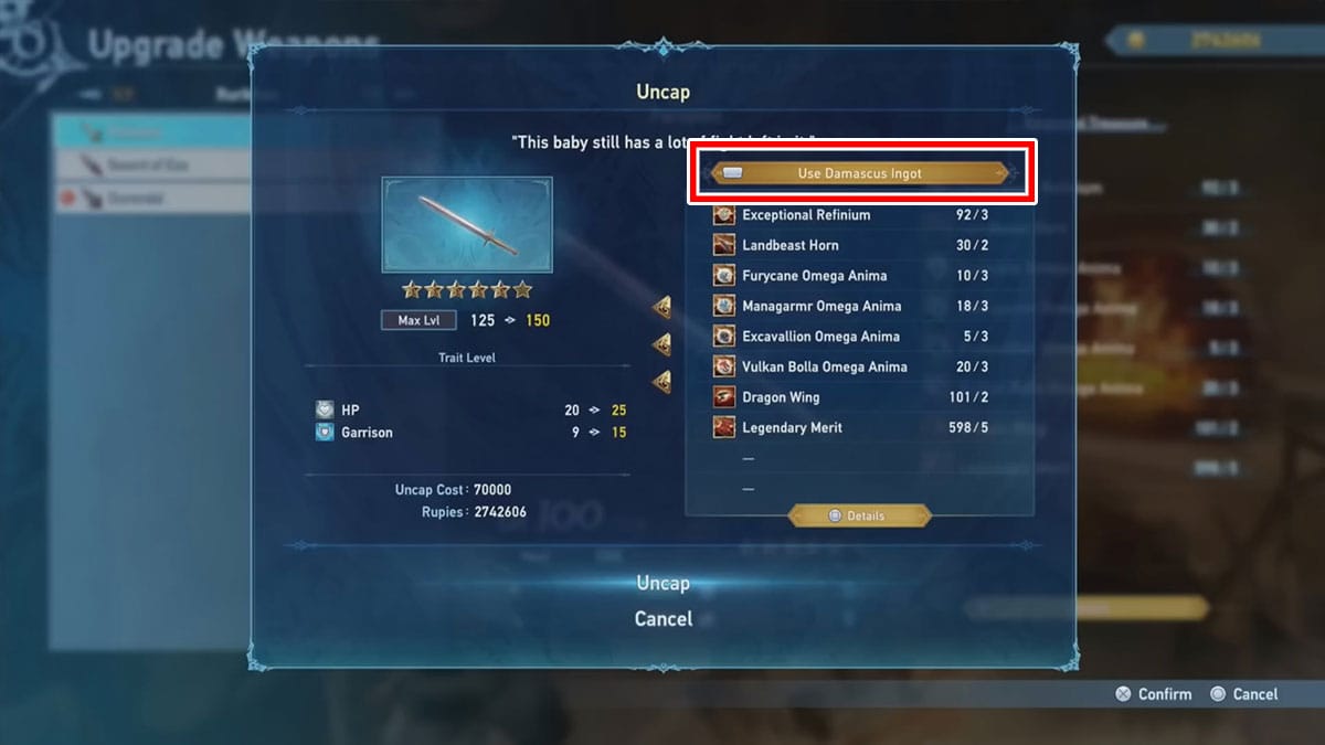 Damascus Ingot are used to uncap your weapon’s levels through the Upgrade Weapons option in the Blacksmith. The common method for uncapping is utilizing a bunch of materials. But if you look closely, you should notice a yellow box with “Use Damascus Ingot” text in it. Press the box and you’ll consume one Ingot to raise the selected weapon’s level cap by one level.