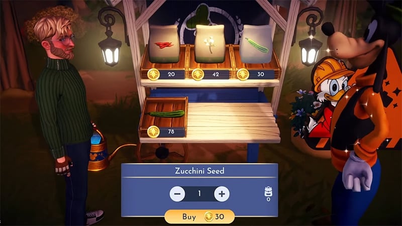 Then, you must unlock Goofy’s Stall in that location and upgrade it twice to get Goofy to start selling Zucchini Seeds. And by purchasing these Seeds, you will be able to plant and grow Zucchini. Finally, wait 40 minutes, and you’ll get Zucchini at Disney Dreamlight Valley.