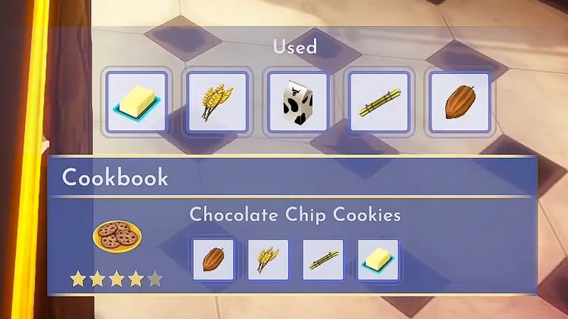 To bake the 4-Star Chocolate Chip Cookies Recipe in Disney Dreamlight Valley, fans will need Butter, a Cocoa Bean, Wheat, and Sugarcane. Since none of these items is an “Any-Ingredient” type, players need to mix these four ingredients at a cooking stove to get the cookies. As mentioned above, Butter can be purchased from Chez Remy for 190 Star Coins.