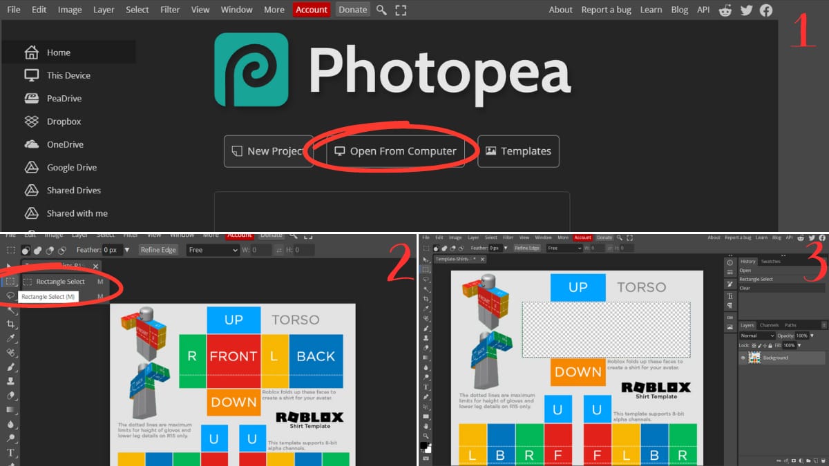 When you’re on Photopea, you’ll go through the following steps to prepare your template so you can make Roblox clothes with ease: