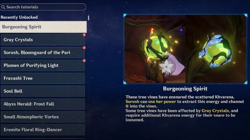 Burgeoning Spirits are tree vines scattered in the Khvarena region. You can use Sorush to extract the energy from these glowing green light balls and channel it to vines. The in-game description also reads.” Some tree vines have also been affected by Gray Crystals and require additional Kharvena energy for their snare to be loosened.”You must interact with the Burgeoning Spirits in a particular order to complete the quest.