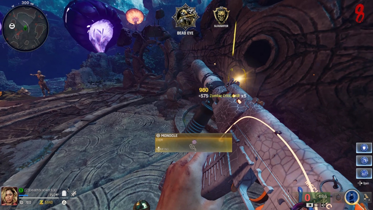 So there are three pieces you need to obtain to create the Ice Staff: The monocle, the head, and the staff. The first one is very easy to get and it’s got no puzzles at all. Just kill the Mimic that spawns on round 8, and the first Ice Staff piece in The Tomb Black Ops 6 Zombies map is yours.