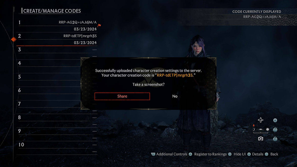 - Once saved, the code for that particular Rise of the Ronin custom character will appear on the save slot. While you can save a hundred custom characters in the “Save/Load Settings” menu, you can only save up to 10 codes in the “Create/Manage Codes.”