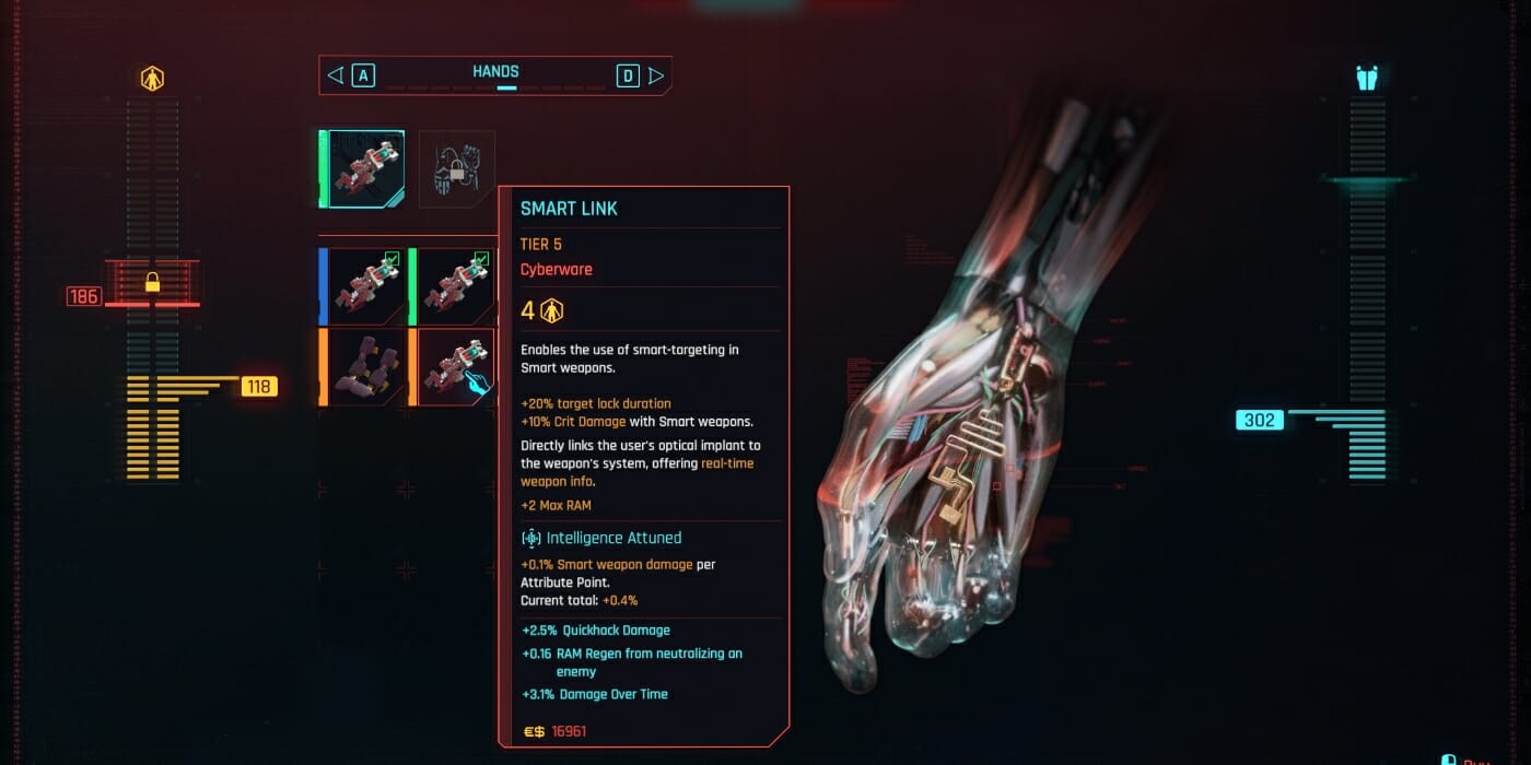 Like other cyberware, the Smart Link comes in multiple tiers, with higher-tier models offering better performance. It’s wise to install the best model you can. That said, they can get expensive. If you’re short on funds, a lower-tier model will still allow you to use Smart Weapons. The Smart Link is installed in the Hand Slot. If you already have hand cyberware, you’ll need to replace it. Alternatively, you can invest in the Ambidextrous Perk to open up an additional Hand Slot. That will allow you to use Smart Weapons as well as your favorite hand cyberware.