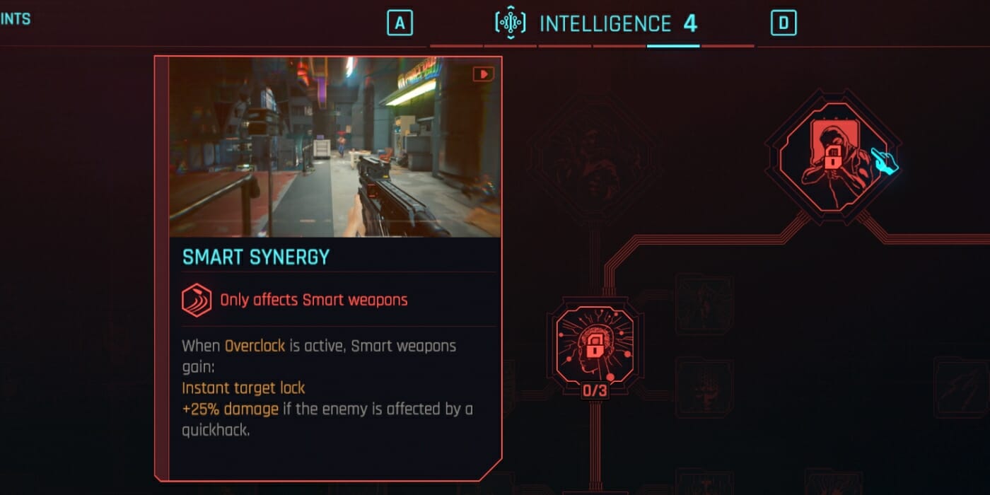 Though anyone with a Smart Link can use Smart Weapons, not everyone can use them well. To squeeze the most value out of these unique guns, you’ll need to pair them with the right Perks. Thankfully, Cyberpunk‘s recent 2.0 update overhauled the Perk trees. That gave Smart Weapon fans a number of excellent choices for their builds. The most important Perk tree is Intelligence, which offers Perks that specifically buff these weapons. Technical Ability is also important, not only for Ambidextrous but also for other cyberware buffs that synergize well with these weapons.