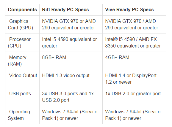For a quick comparison, here is a graph showing the requirements for the Vive and Oculus Rift, both virtual reality headsets launching for the PC.