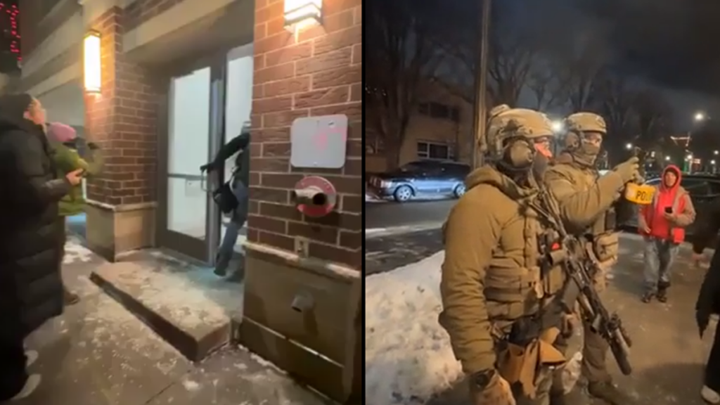 The video showcasing the event starts shortly after ICE agents break the glass door to invade the premises. They can be seen climbing the stairs as a woman yells at them from outside. She repeatedly says that she hasn’t seen their badge numbers and that they cannot enter the building in the middle of the night, but the agents ignore her.