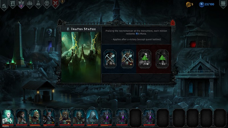 These battles will span across five dungeon maps and involve various types of enemies, all with different strengths and weaknesses. At the end of these maps, the player will then need to beat a boss to pass on to the next dungeon. However, In between your conquest of the living, you will also have several opportunities to heal up, level your undead minions, or craft items in a section called The Chamber of Iratus. There is also an area within this section where you can build upgrades to a graveyard that gives various benefits to help you through the course of the game.