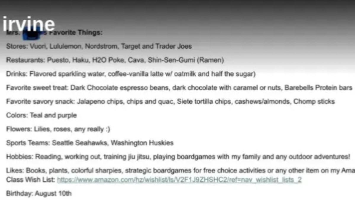 The detailed list was categorized as favorite stores, restaurants, food, drinks, and hobbies. Under the section of her stores, the teacher mentioned Vuori, Lululemon, Nordstrom, Target, and others. She also listed her favorite restaurants as Haku, Puesto, Cava, H20 Poke, and Shin-Sen-Gumi, from which she specifically asked for ramen.