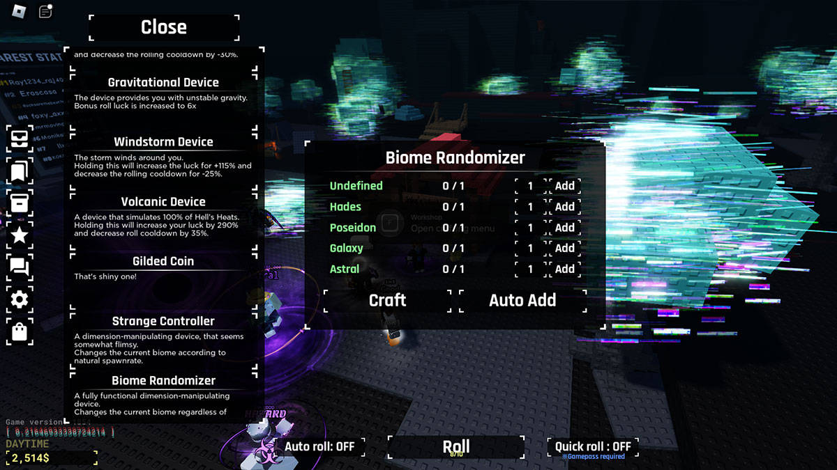 While Strange Controller and Biome Randomizer items exist, they cannot be used to roll Glitch as well. Both items can be used for an infinite amount of time with a 10-minute server-wide cooldown and a personal cooldown of 20 minutes. Strange Controller will swap the current biome with random ones at their normal rate, meanwhile, Biome Randomizer gives any biome a 1/7 chance to spawn. Nevertheless, the Glitch biome will not be part of the rotation pool of both Sol’s RNG items.