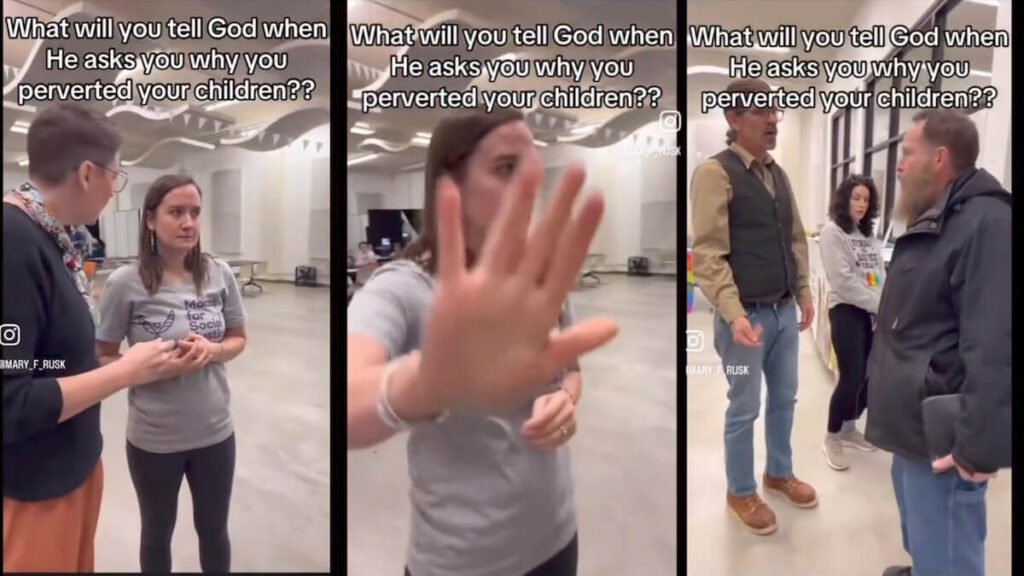 The male preacher then began to confront those present, accusing them of harming children and warning that they would one day answer to God for it. “What will you tell God when He asks you why you perverted your children?” he shouted. “That’s what you need to care about.”