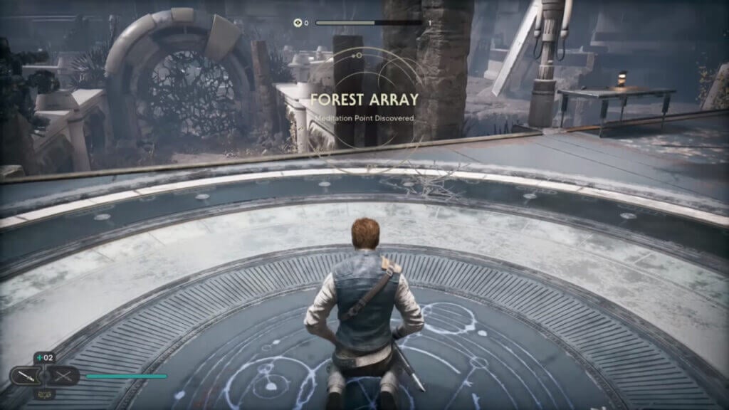 Luckily, they are no challenge for our hero Cal. Once you eliminate them, you need to get to the platform located at the center of the chasm. Now, use Force Push and get your BD-1 to launch the zipline. This time, it is a success, but you still won’t be able to reach the Forest Array in Jedi Survivor. Prepare to use the grapple as you will need to climb the ledge. Continue your way until you reach the Mediation Point.