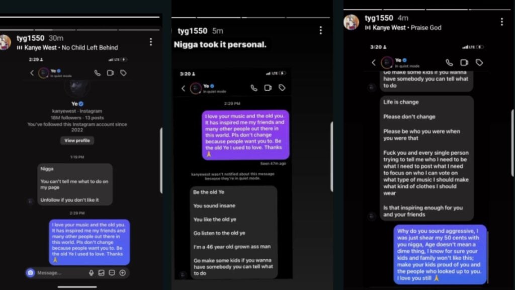 An exchange between Kanye West and a fan has sparked controversy online. The altercation began after the fan, Tyg Savage, urged the rapper to go back to his old self. Displeased, the Yeezy mogul slid into the fan’s DM and gave him a piece of his mind. Savage didn’t back down either, responding to each of Ye’s messages, albeit in a respectful manner. Later on, he shared screenshots of the conversation, which stirred a heated debate. On one side, some fans rallied behind the rapper to show support. But on the other side, fans noted that Savage was right about Kanye West’s old self being better.