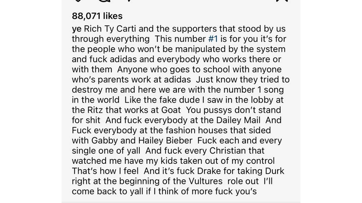 “F**k adidas and everybody who works there or with them Anyone who goes to school with anyone who’s parents work at adidas Just know they tried to destroy me and here we are with the number 1 song in the world.”
