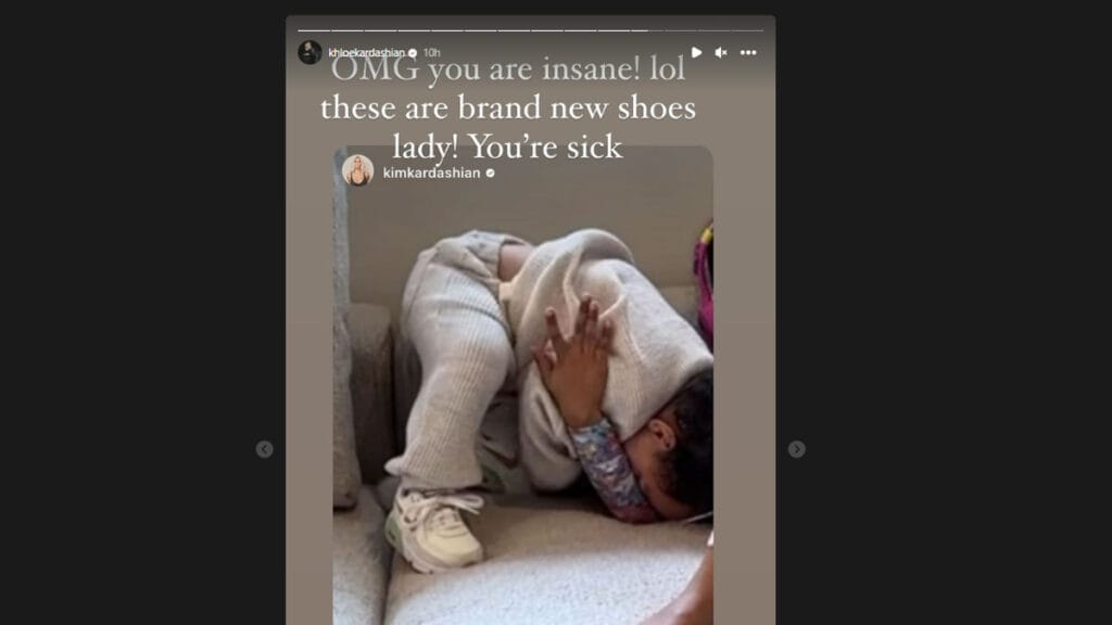 Kim’s playful shot at Khloe’s hypocritical behavior was enough to get the latter’s attention. Shortly after, the mom of two took to her Instagram Story to repost Kim’s close-up picture of Tatum’s shoes on the sofa. Khloe accompanied the photo with a fireback at Kim, writing: