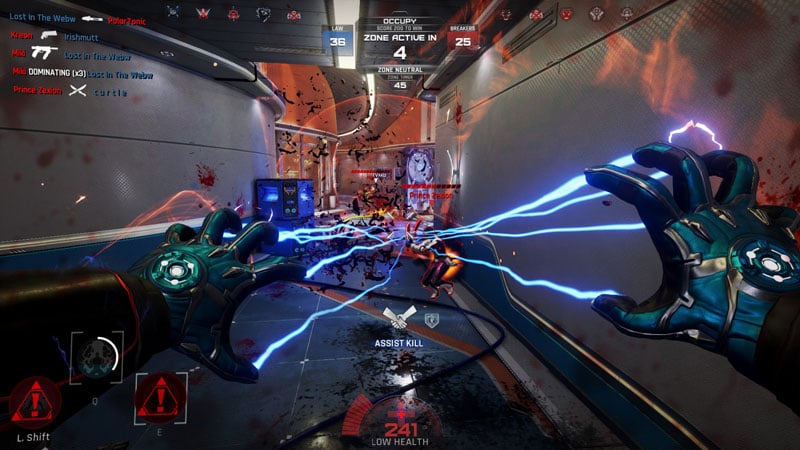 It’s LawBreakers’ innovations that save it from being just another bland shooter in the crowd. First, the mobility. Each character has a different way of getting around beyond the basic running and jumping. There are rocket boots, grappling hooks, triple jumps, teleporting. Sure, those are all in Overwatch, but LawBreakers adds another layer, “zero gravity” combat. In each level, there is a zone where gravity is extremely light (Nerd Note: They call it “Zero G,” but you jump in parabolic arcs and can die from falling, so there’s at least some gravity) and the player can bounce around and use their mobility powers to zip all over that part of the level, missing every shot because this is a first person shooter and you have next to no precision when whipping around in all directions.