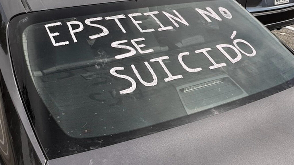 “For those who dont speak spanish… the car on the left says “epstein didnt commit suicide” and the car on the right says “mister”.”