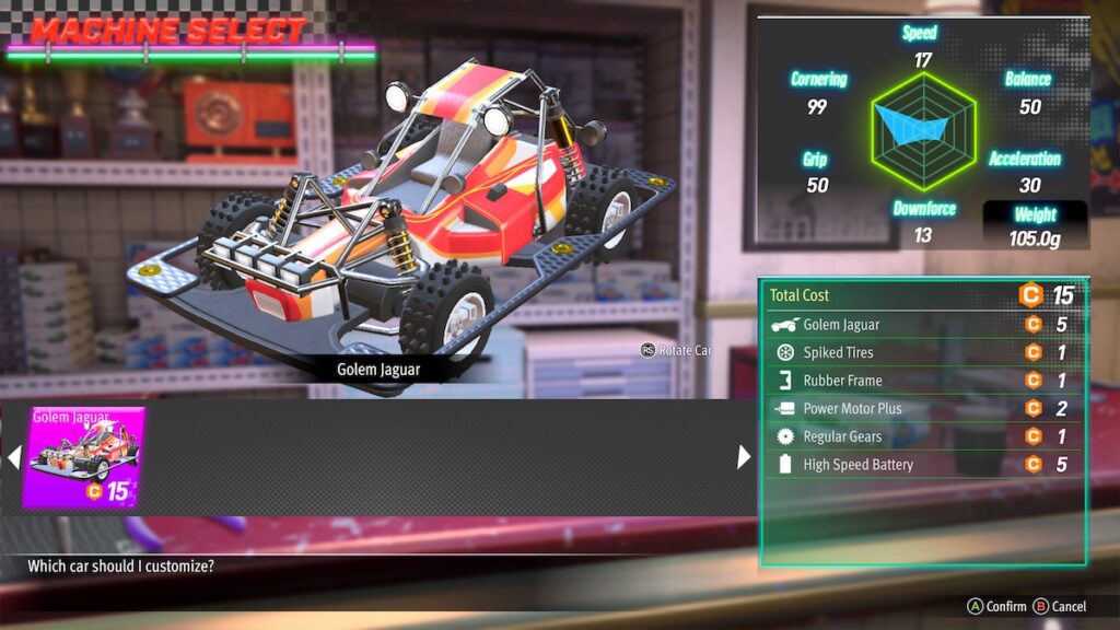 As for the best parts to use for each race, it depends a bit on the race itself. When you pick a race, you will be shown the layout of the track, the cost limit, and any special sections, like a jump. If a track has a ton of turns, you will want more grip and cornering. If there are a bunch of straight sections, you could sacrifice those stats for speed. The races are pretty short, so if you aren’t sure which stats to focus on, run the race and figure out where to improve. As you progress through Pocket Circuit, more parts will become available.