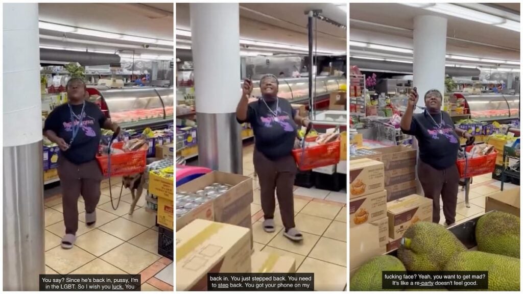 “Yeah, f*ggot. You need them. I don’t.” utters the furious woman, as she turns to walk away. At the end of the clip, you can hear her exclaim under her breath, “Disrespectful piece of sh*t. And you stare at my t*ts, you f*cking creep. You know what the f*ck you did. Get that on camera, you f*cking creep. And you’re recording me in the back of the f*cking store in the corner. That’s proof enough. You b*tch.”