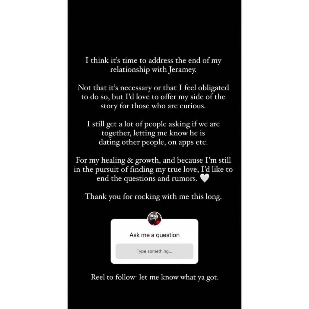 “I think it’s time to address the end of my relationship with Jeramey.”