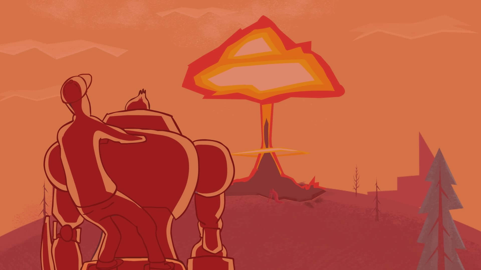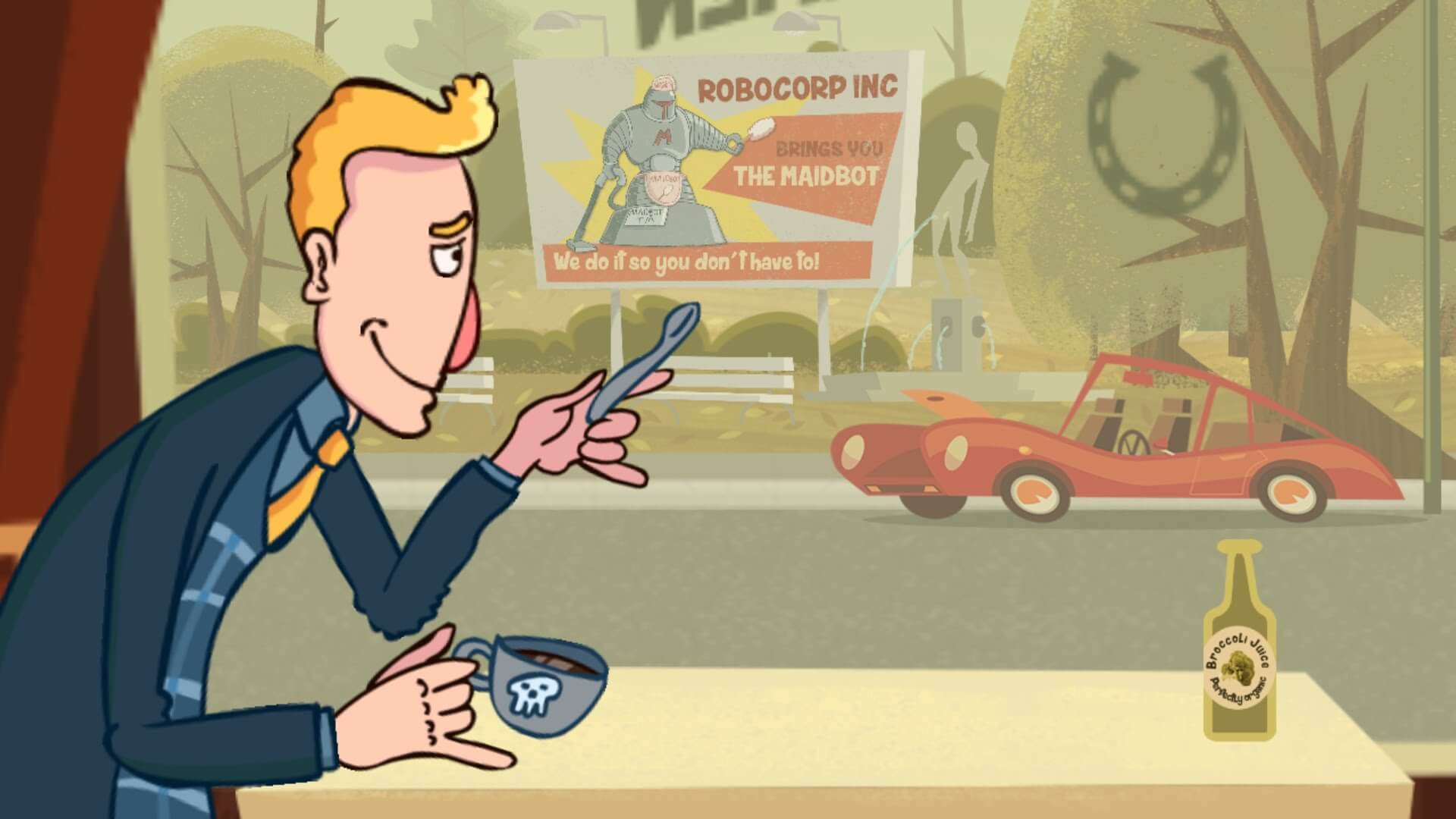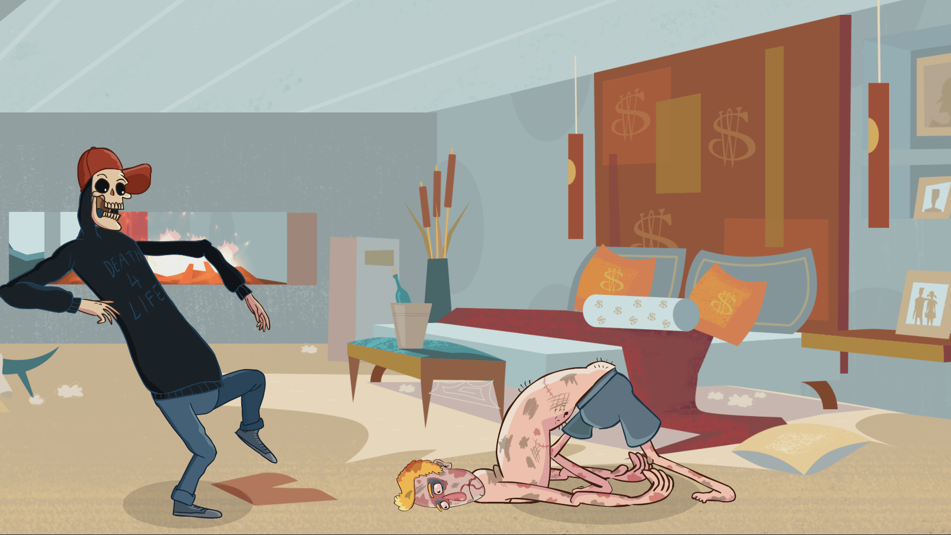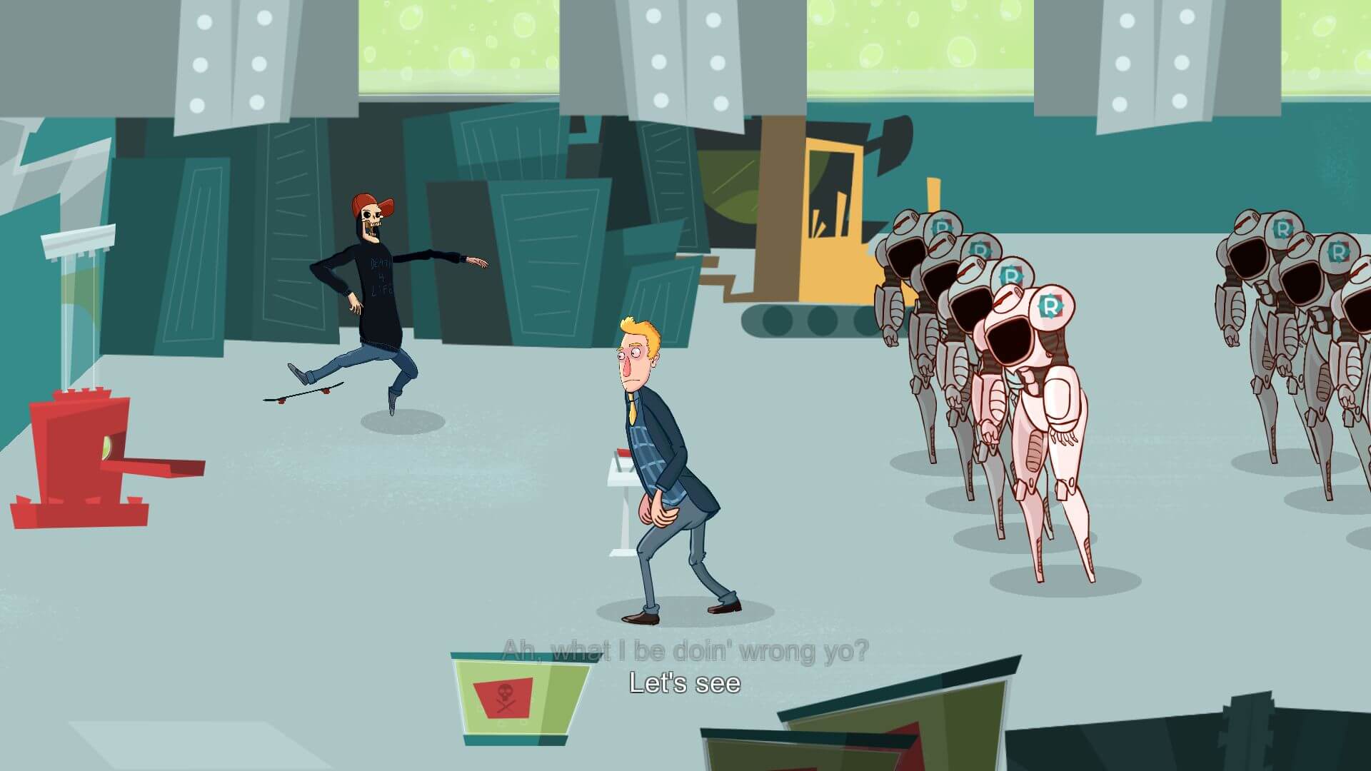 You then enter your work, Robocorp. First, go to the front desk and play a short mini-game where you try and ask the employee at the desk for a new key card. The elevator is out, so you will have to take the stairs. Take the climb slow, as one wrong foot will send you plummeting to the bottom. Once entering your office you have the choice to either make a cup of coffee or go and play another round of Flappy Rooster. Upon attempting to play the arcade cabinet, Ingrid your secretary will alert you to the fact that your father wants to speak with you. Take the elevator to Samuel Senior’s office. Tired of Sam always showing up late, his father sends him to work as a Liphidium Inserter in the storage room. Once in the storage room pull the red lever to the left of the robots, this will cause Liphidium to be produced by the red machine on the left-most side of the room. Pick up the Liphidium and place it in each of the robots. Then you will need to place the material in the large machine on the other side of the room behind the automated door. Pull the red lever on the right of the room then return to the Liphidium dispenser as quickly as possible and cross the room and through the automated door, with the Liphidium, before it closes. After completing this task twice, Death will attempt to perform a kickflip, which will result in him breaking a pipe, which in turn releases Liphidium all over the robots. This cause the robot’s level of consciousness to become too high, and the break out of the Robocorp facility. Sam must escape the storage room. Be careful to not breathe in, as the fumes in the air will cause Sam to go blind. In a meeting where Robocorp executives try and decide what to do next, Death forces Samuel to volunteer to deal with the robots, who are now heading towards an orphanage.