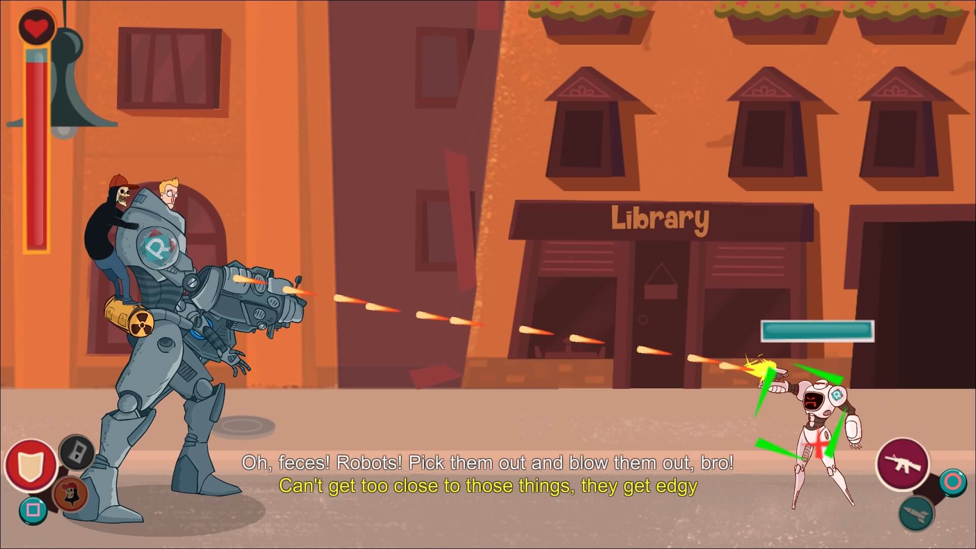 Sam moves through town, outfitted with an enormous mech suit. Primarily you’ll be using your machine gun to take out enemies, as the rocket launcher has a relatively slow reload time. You’ll also want to use your shield to stop enemy bullets. The shield will not, however, defend against missiles or charging enemies. When facing the larger missile launching robots, you’ll want to shoot down their missiles and then immediately switch to your own missile launcher, in order to lay down a large amount of damage. After one shot, return to using your machine gun and wait for them to fire again. There will also be some enemies who are protected by energy-based shields. Switch from your machine gun to your throwing arm and hurl Death towards them, to disable the shield. Be warned however that as long as Death is not riding on your back, you will have to manually breathe once more. As you reach the orphanage you’ll face a boss, the Maidbot.