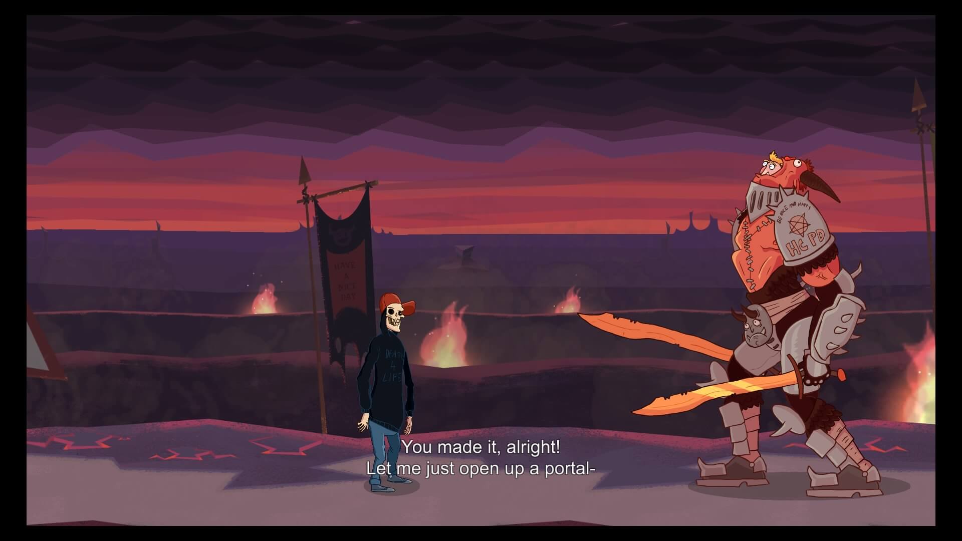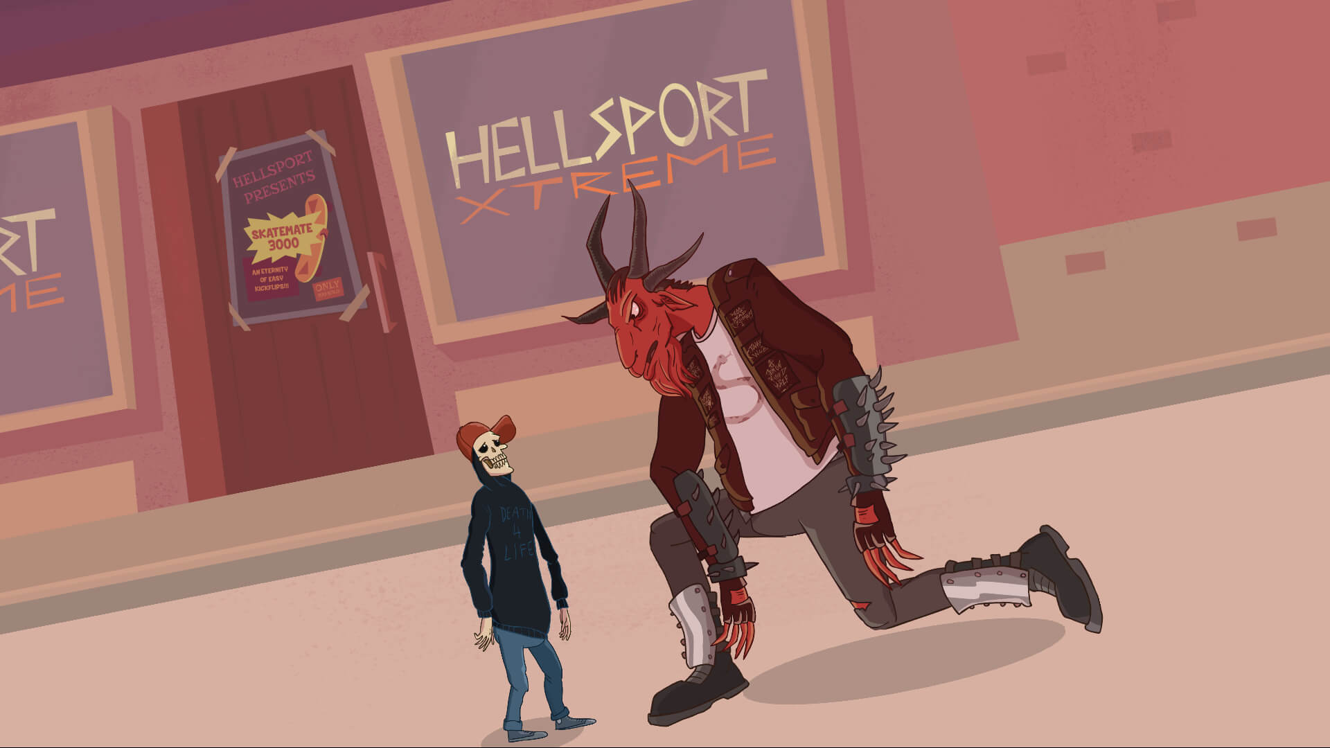 When fighting Satan you will have to remember several move combinations. When he stomps his foot, move as quickly as possible towards Satan as fireballs rain from the sky. When Satan begins to raise up into the air before breathing fire, run towards him and attack. When he swings from the side, you will only be able to dodge by making yourself fall over. When he swings from above hold down the block buttons as long as possible, and if the sword is on fire, blow outwards to cool it down. After defending against Satan’s attacks you will receive a chance to try and speak to Satan. It is these moments that lower his health. Upon defeating Satan Death will finally land a kickflip over Satan’s head, triggering the game’s ending.