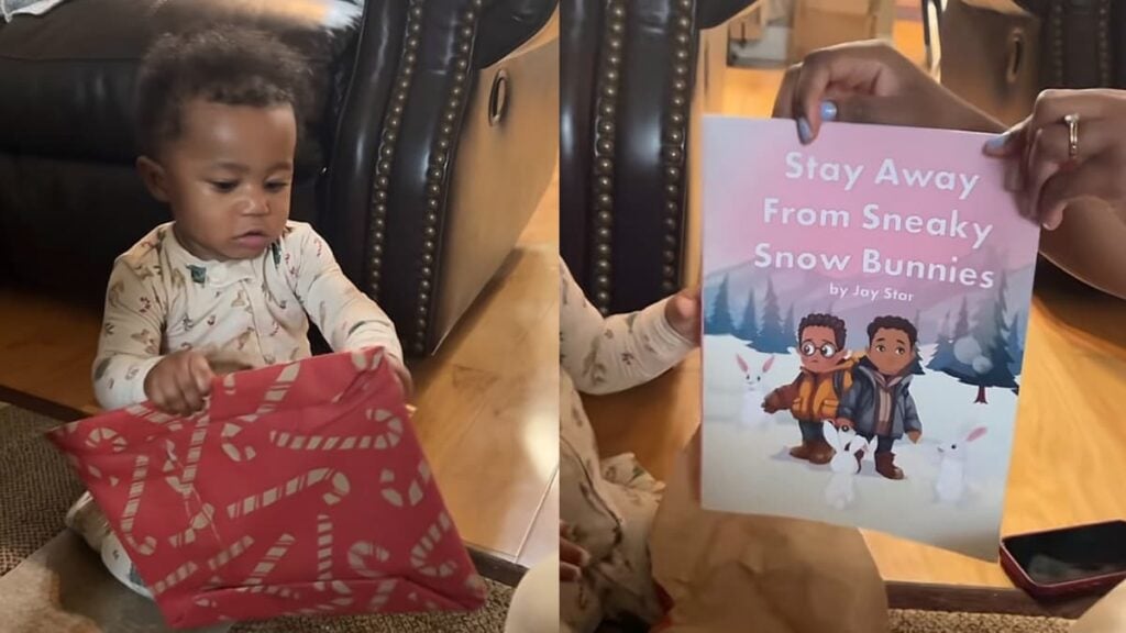 In the short clip, the mom filmed her young son as he struggled to open a present she had bought for him. As she encouraged him, she eventually stepped in and started unwrapping the gift herself. When the wrapping came off, it revealed a children’s book titled Stay Away From Sneaky Snow Bunnies by Jay Star.