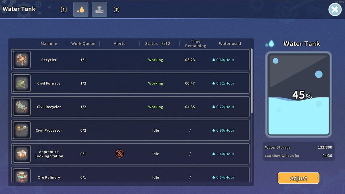 Once you get Water for your Water Tank, interact with it to view your Water consumption each hour. Click on Adjust, then use the slider to choose how much Water you want to insert. If your tank runs out of Water, your machines will overheat and halt production until the tank’s been refilled. That said, remember to frequently check on your workshop’s Water Tank, especially when you notice a red, cross-outed water droplet symbol above your crafting stations.
