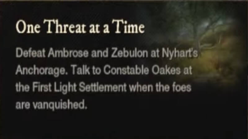 The Quest “One Threat at a Time” will task you with taking down two undead pirates: Boatswain Ambrose and Quartermaster Zebulon. Zebulon isn’t that difficult to find (there is a reason the guide isn’t about him), just follow the marker on your map and you’ll find him. Ambrose is a bit more difficult because of the verticality of the location that you find him in. Nyhart’s Anchorage has several buildings and houses that go up, with several flights of stairs. Because the map is looking from a top-down perspective, you don’t know what level he is on. It may appear that you are standing in the right spot, but if you have wood under your feet, you are too high up. You have to make your way down to the bottom of the anchorage, below the boardwalk, and through a small archway on ground level.