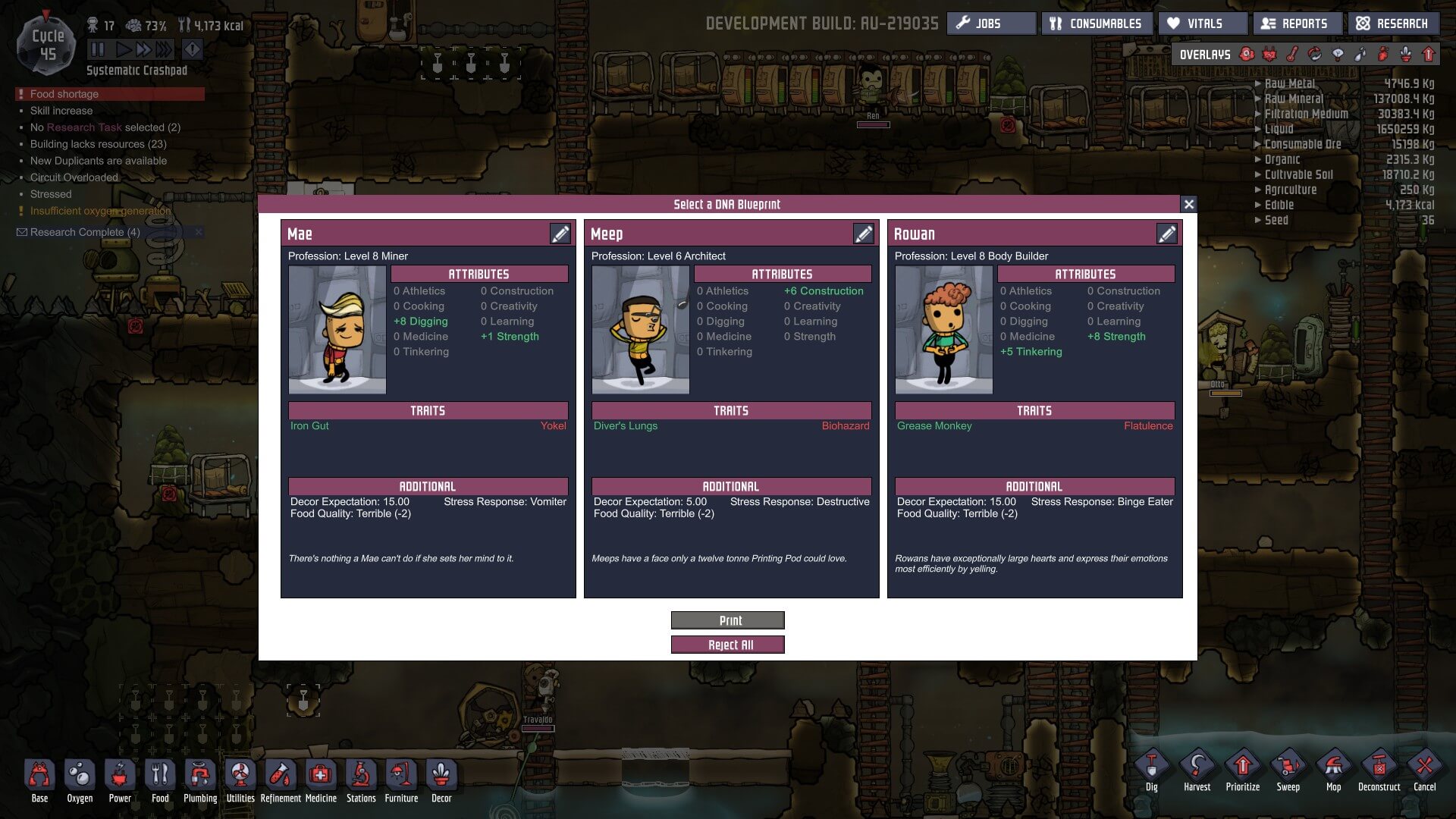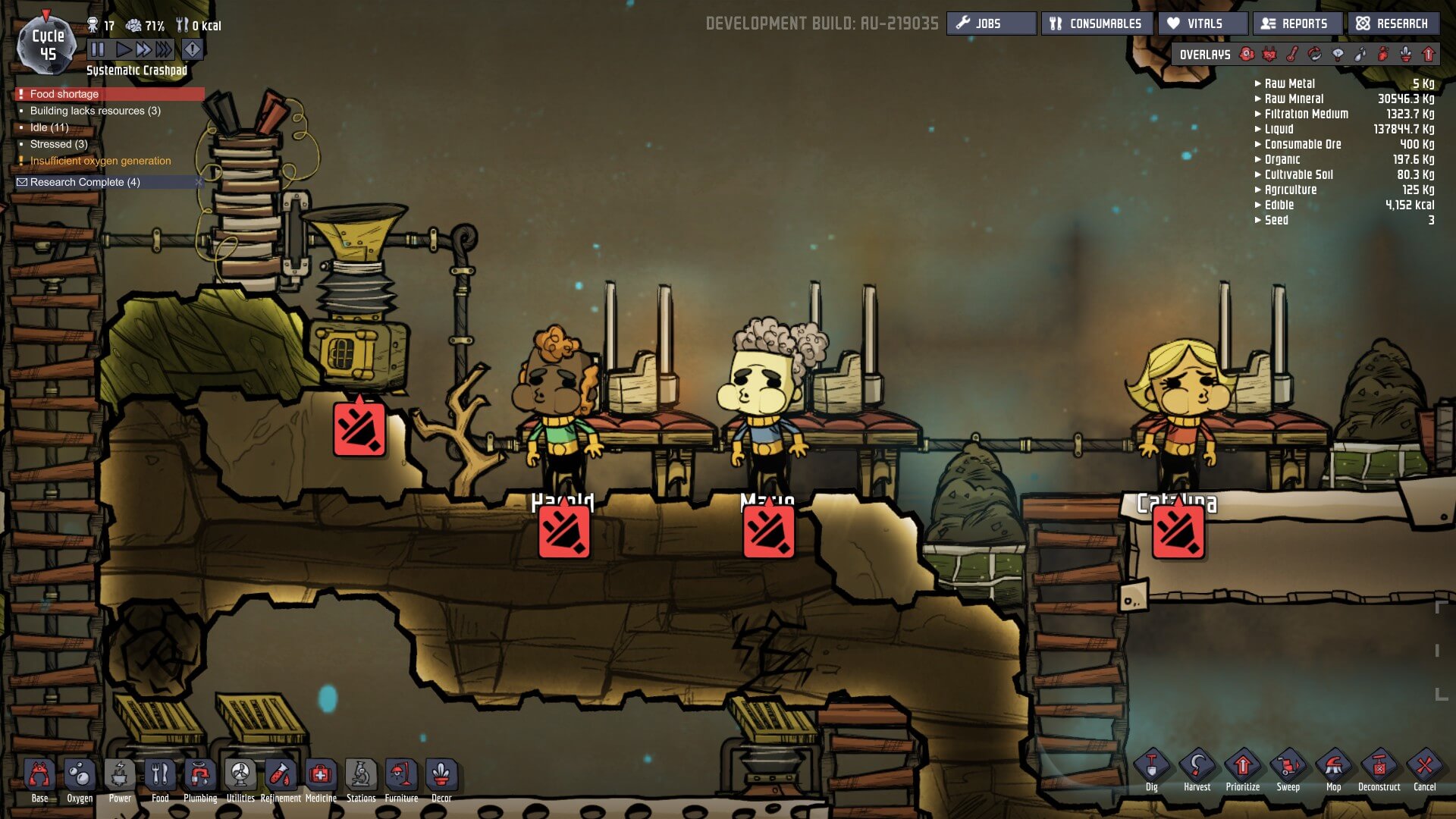 Not only do your workers get killed by everything, but they also get stressed by everything. And when they are stressed, they are less effective workers. Some workers are picky eaters and will get stressed out by low-quality food (like the diarrhea-inducing mush bars, which are made out of dirt and water). Some need art around them to keep from getting stressed. Still, others just need a massage on occasion. There is a ton of stuff to balance, and that’s where some of the problems with Early Access come in.