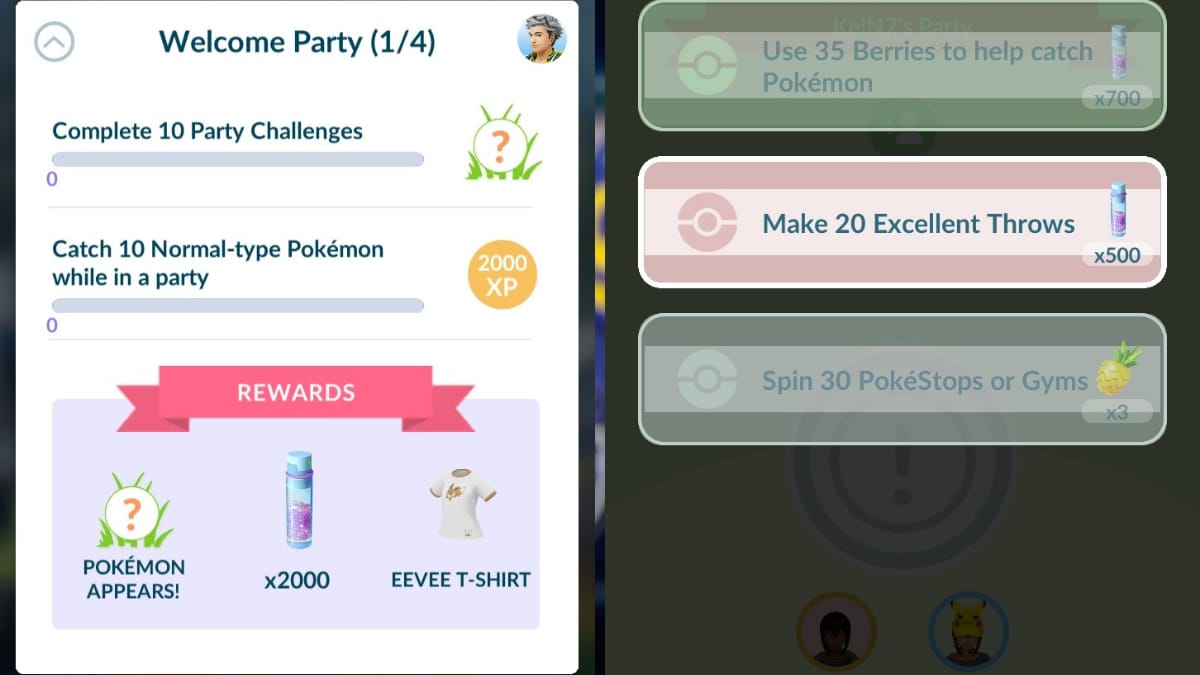 As we mentioned before, party challenges vary. Some are based around battles, while others task you to make a specific number of Excellent throws. You only complete one challenge at a time. If you start the party, you decide which challenge to tackle. Seeing the rewards, more so the encounters, makes theย Pokemon GOย Welcome Party worth the wait.
