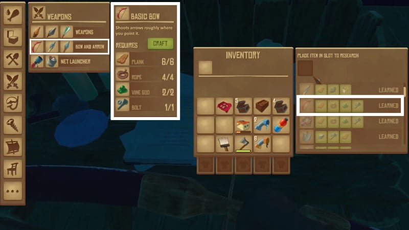 To craft a Bow inย Raft, players must first discover its recipe via the Research Table. Constructing a Research Table requires Plank ร—14 and Scrap ร—2. Once the workstation has been set up, place a Plank, Rope, Vine Goo, and Bolt into the research slot to learn theย Bow recipe inย Raft.