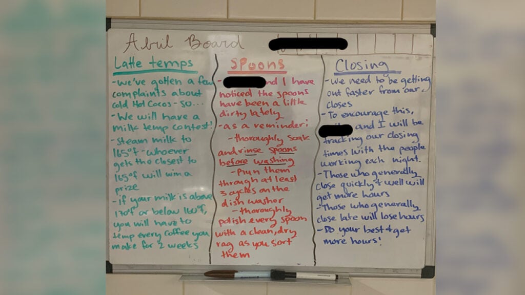 The whiteboard is divided into three sections: Latte Temps, Spoons, and Closing. At first glance, the notes might seem harmless, just typical workplace reminders. But a closer read reveals a more troubling undertone.