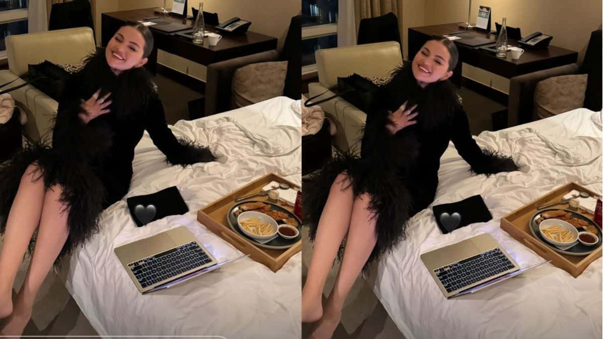 The Come & Get It singer shared a photo of her unwinding after attending the Toronto International Film Festival. In the playful snap, she rocked a luxurious robe with fur trimmings at the end of the sleeves. She flaunted her glammed face while sitting on the edge of her hotel bed. Next to Gomez was a laptop and a tray of food. It comprised pieces of chicken strips, french fries, ketchup and a can of soda. She seemed to be having a swell time in the hotel as evident the wide smile on her face.