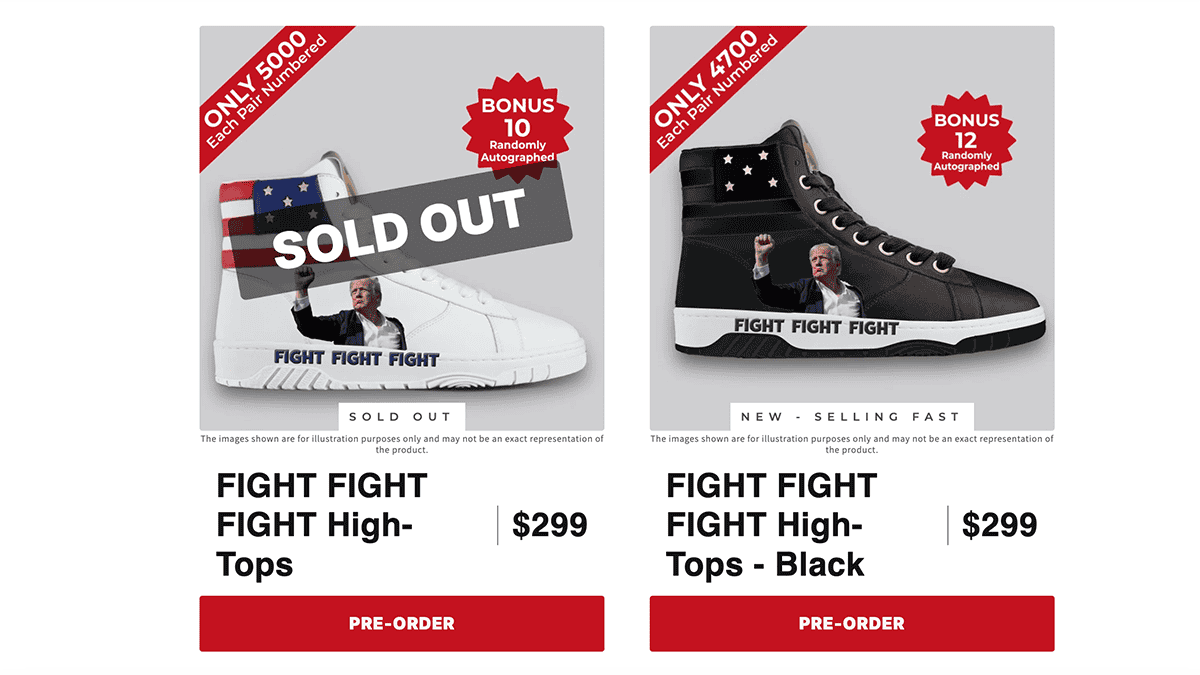 With US citizens in a frenzy in the wake of former President Donald Trump’s assassination attempt, what would be an ideal course of action? That’s right โ buy some limited-time sneakers! First, we had absurdly priced trading cards and NFTs. Now, the political superstar has sought to profit off his own assassination attempt, and to no one’s surprise, it’s working! On Official President Donald Trump Footwear, the white version of the FIGHT FIGHT FIGHT High-Tops sneakers has already been sold out โ at $299 each.