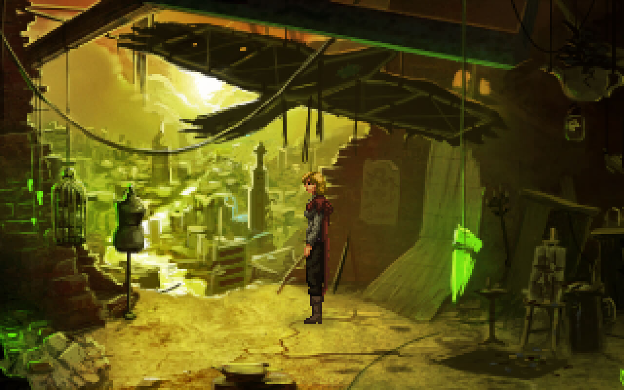 The scenery and graphics were the next syringe to induce nostalgic feeling into my veins. From the site of the market district, alone. Customers were roaming to every food or salvage stand, walking by or chattering among themselves. I was astonished by how well detailed a point and click could be. Cracked and abandoned store buildings hung signs that would swing side-to-side and rats could be spotted scurry between trash cans. Not many titles (since the 90’s) have accomplished a level of detail or finesse when creating an atmosphere to get lost in. The graphics were dated but meant to recreate the same old school resemblance to similar titles as Monkey Island series or Gabriel Knight. Although, the resolution was a bit much as I felt as though I was playing at 800×600. Even the portraits found next to the dialogue when speaking to a random character would give a soothing sense of good vibes – apart from their blurred pixilated bodies standing idol.