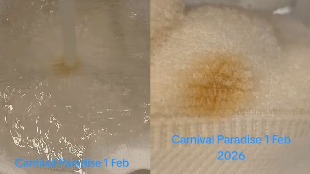 The water on the Florida cruise appeared to be contaminated, especially as a brown stain quickly spread across the towel. “The entire ship smells like poop,” the man said. “Carnival you can do better,” he added, directly addressing the cruise line. As the water continued to run, the brown spot on the towel grew darker and larger. It was hard not to wonder what could be causing the discoloration. The man then lifted the towel from beneath the faucet, clearly showing how the water had turned part of it brown. To further prove his point, he placed a second clean white towel under the running water. Almost immediately, the area where the water hit began turning brown as well. He lifted that towel too, once again revealing the stain. Based on what was shown, the water did not appear safe to use.