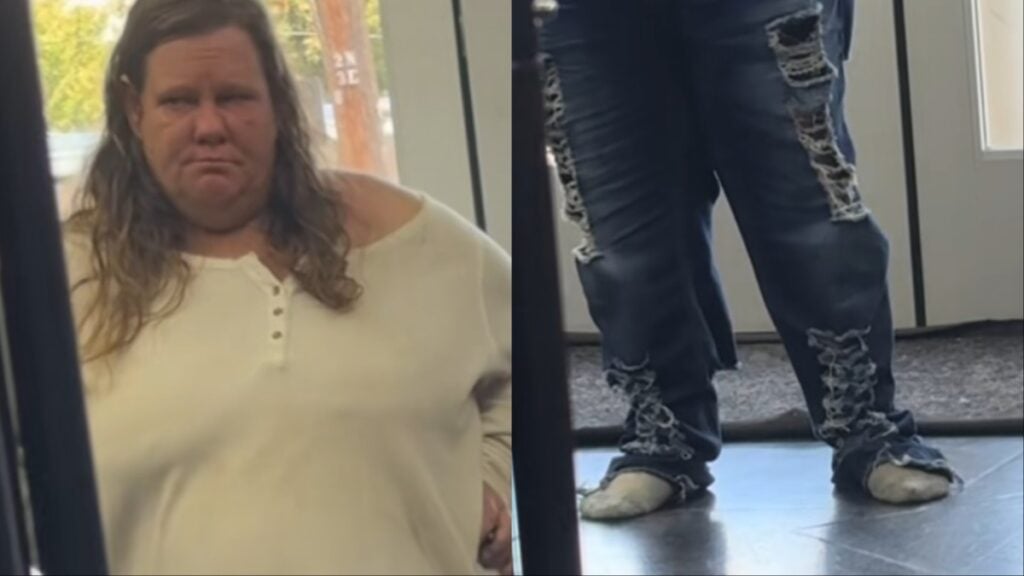 The TikTok begins with a woman walking into the shop, and she isn’t necessarily dressed to be in public. The Texas woman’s outfit inadvertently draws attention; the video even zooms in to point it out. The woman can be seen wearing a stained long-sleeved shirt, as well as a pair of jeans that look too big for her. However, to top it all off, she isn’t wearing any shoes, just socks right on the pavement.