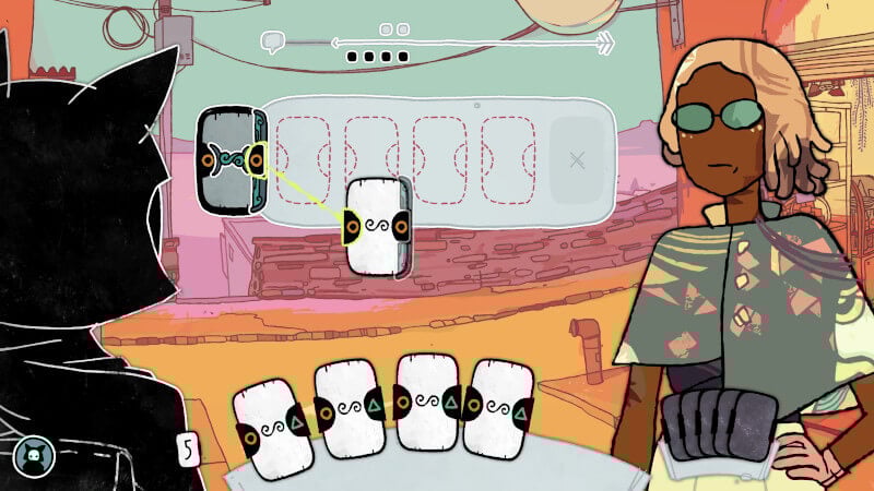 Virtually all of this information is conveyed to players through Signs of the Sojourner’s elegant card game conversation mechanic. Almost the entire game is made up of conversations between the various colorful characters in the game and the player character. To engage in conversation the player and the character in question play cards with symbols on their left and right edges. These symbols represent various modes of thinking, attitudes, and vibes, like ‘Logical and Diplomatic’ or ‘Empathetic and Observant’ for example.