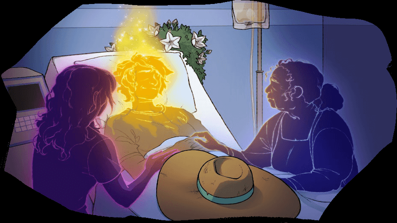 Here she meets the sweet elderly couple, Astrid and Giovanni. Having never met her own grandparents, she quickly became close with the pair who informally adopted her as their granddaughter. Stella also had an aunt who lived nearby named Rose. Rose’s partner, Summer, was the woman who became Stella’s spiritual mentor, teaching her to embrace what she called “universal love.” Sadly, Summer passed away due to cancer, which the game symbolizes by the “dragon.” This second soul-crushing loss inspired Stella to become a hospice nurse, tending to those patients who have little time left in life. These patients include some of the passengers you meet on your voyages, like Alice or the two brothers, Bruce and Mickey.