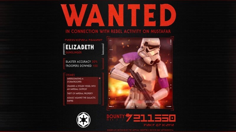 A new feature is added to the Star Wars: Secrets of the Empire experience. After completing the in-game mission, players will see a Wanted Poster of themselves. These posters are very unique and feature a photo of your characters as if taken from a security camera. They also list your crimes as done in the game, as well as the bounty the Empire placed on your head. Much like a score, you get in other video games to determine how well you completed the mission, the higher the bounty the more dangerous you are considered. The posters were inspired by the Wanted posters for the characters in Star Wars: Rebels.