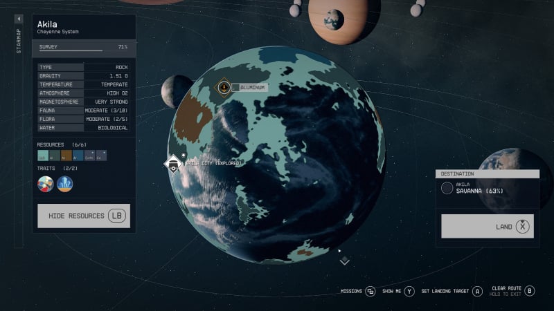 Before landing, you should always press LB to scan the planet. This will show the planet’s areas that hold a certain resource. If you want iron, move the planet around until you spot a place with iron and land on it. However, there’s another system the game doesn’t tell you about.